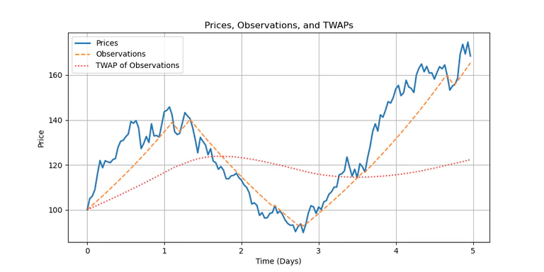 Normal TWAPs also have their flaws. For example, a Solana validator could manipulate a TWAP by setting the price extremely high for a few slots. If said validator controlled 1% of slots, they could force a proposal through by 100xing the pass price during their slots. We deal with this by using a special form of TWAP we call a lagging price TWAP. In a lagging price TWAP, the number that gets fed into the TWAP isn’t the raw price - it’s a number that tries to approximate the price but which can only move a certain amount per update. We call the number that gets fed into the TWAP an observation.